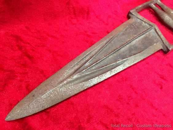 The katar or katara,is a type of push dagger from India.The weapon is characterised by its H-shaped horizontal hand grip which results in the blade sitting above the user's knuckles. Unique to South Asia, it is the most famous and characteristic of Indian daggers.Ceremonial katar were also used in worship.The basic katar has a short, wide, triangular blade. Its peculiarity lies in the handle which is made up of two parallel bars connected by two or more cross-pieces, one of which is at the end of the side bars and is fastened to the blade. The remainder forms the handle which is at right angle to the blade. Some handles have long arms extending across the length of the user's forearm. The handle is generally of all-steel construction and is forged in one piece together with the blade.
